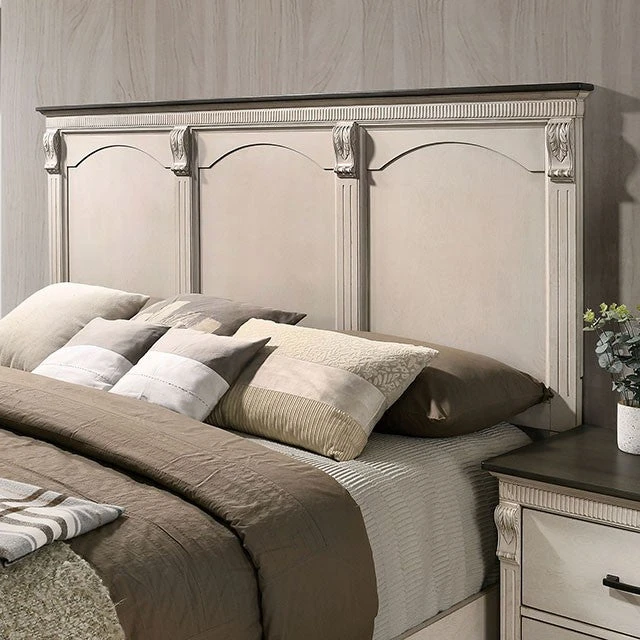 This bedroom set will fit in well in a Mediterranean-inspired space. The headboard and footboard feature fluted panels and columns topped with foliage details reminiscent of classical architecture. The color palette hints at history as well–the antique white finish partnered with the gray top pieces lends a unique kind of worn-out charm. Simple horizontal dark bronze hardware on the case goods completes this fine-looking ensemble.