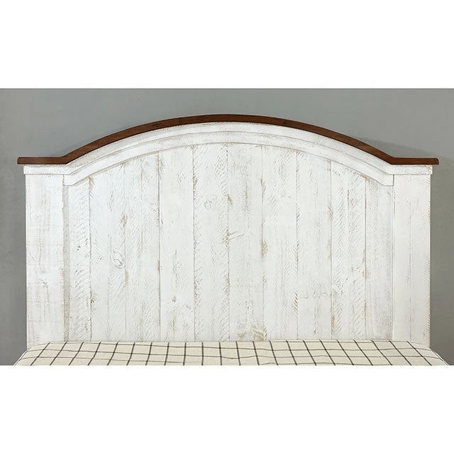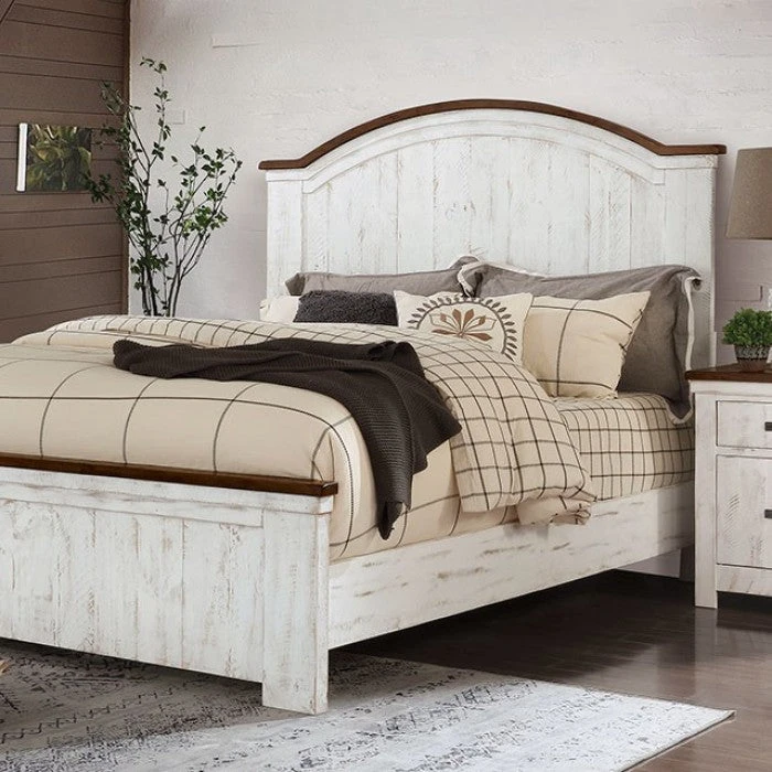 A distressed-white finish highlights this bed that establishes a mood of antique integrity. It is elegance defined.