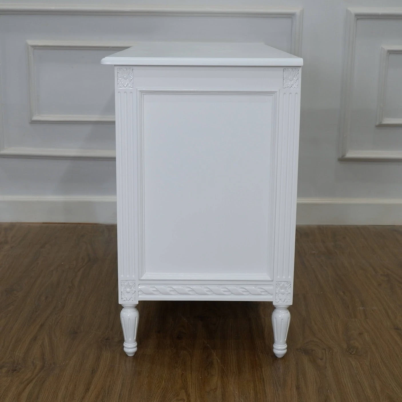 Indulge in the luxury of the Andorra dressing table in soft satin white. This piece is reminiscent of a bygone era. Its design is based on Louis XVI furniture, a timeless classic. The finest of detailing gives this piece a subtle elegance with a soft scroll on the mirror and gradient drawer sizing. Handcrafted from sustainably sourced Mahogany and painted in a refined white for an elegant touch.