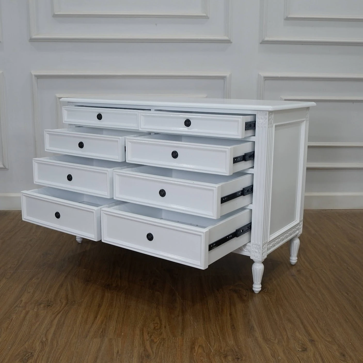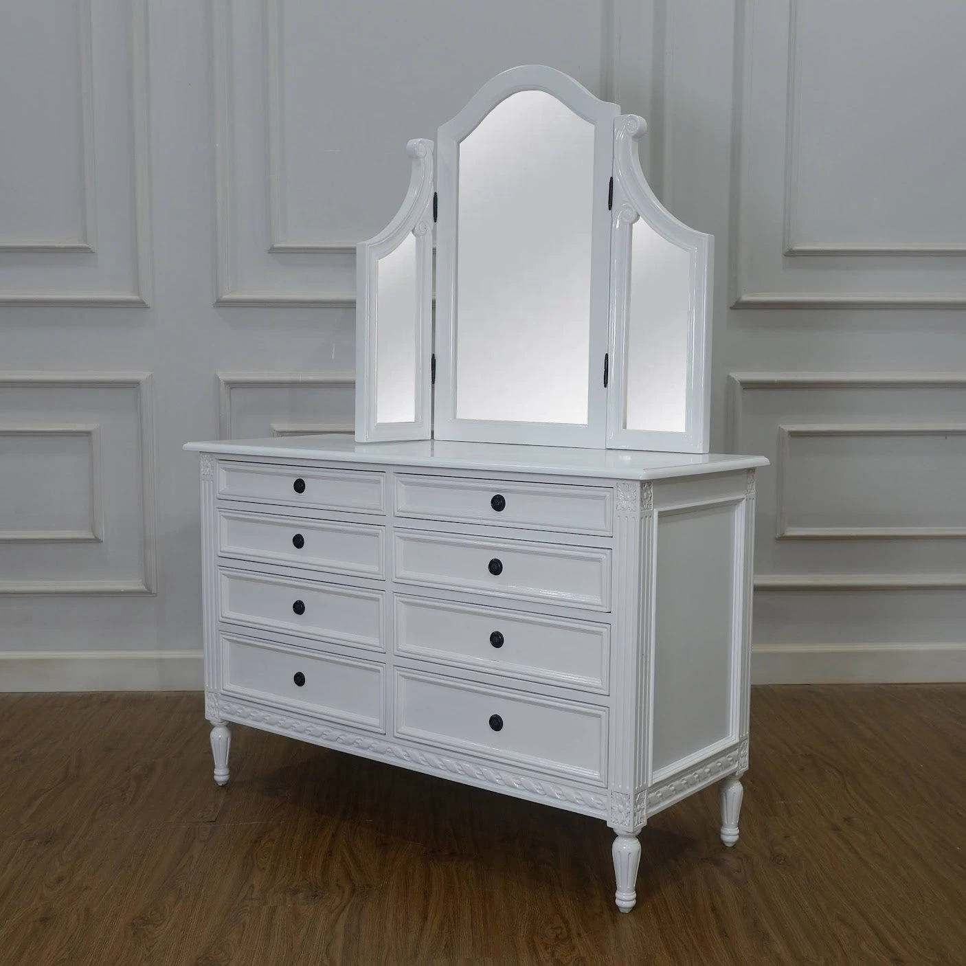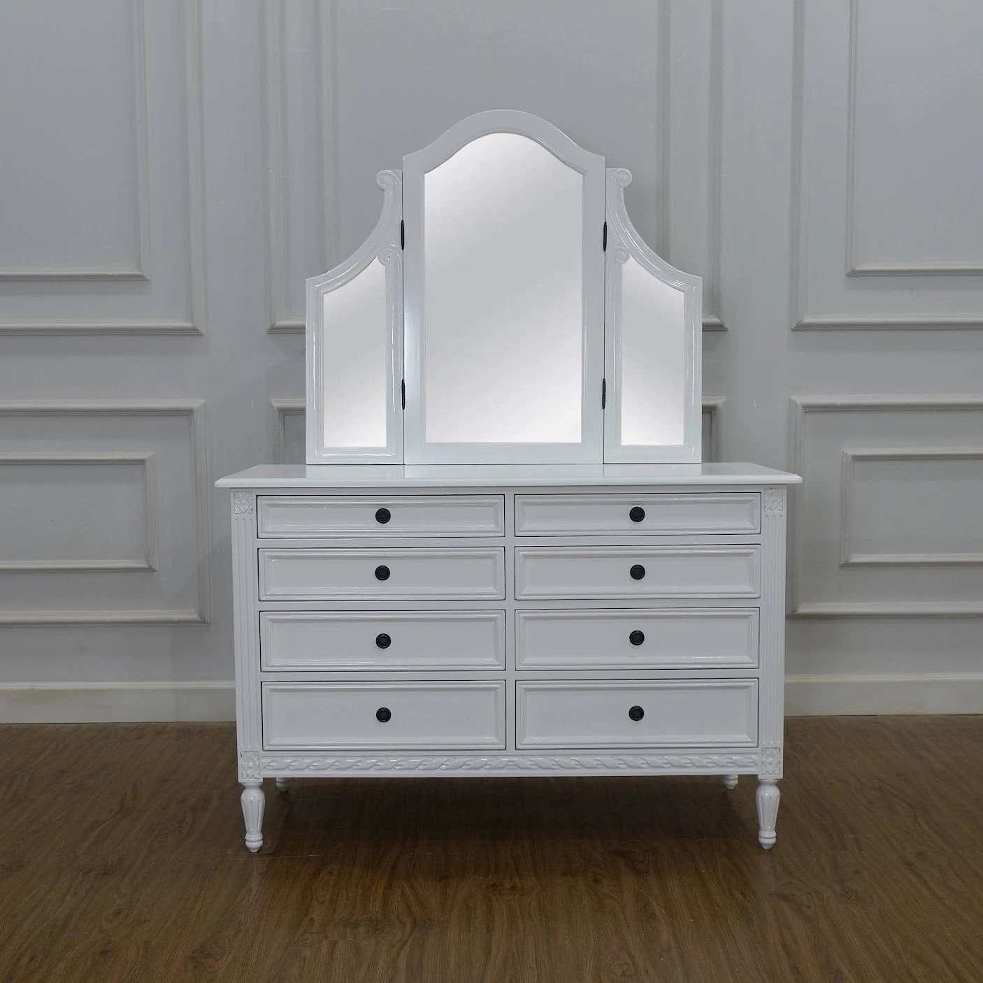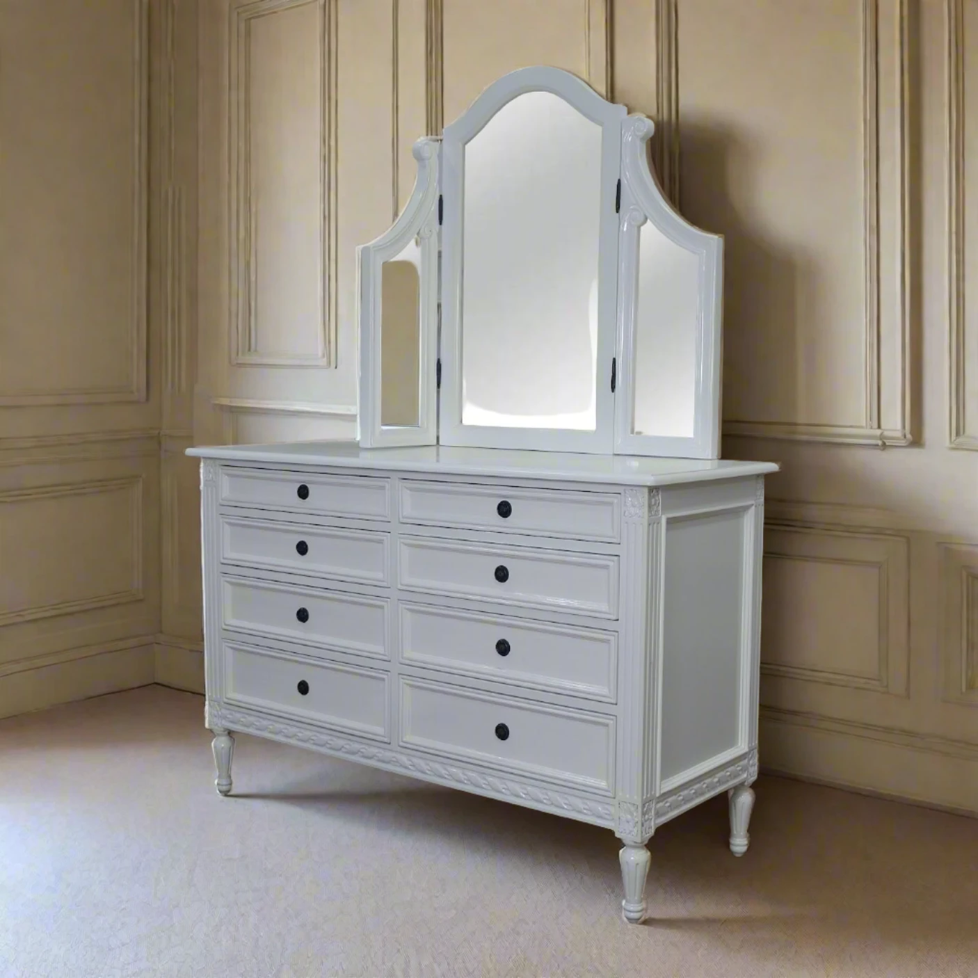 Featuring full extension drawer runners, a velvet lined top drawer and hinged mirrors. Mirror attaches with solid brackets for a strong and sturdy structure. Arrives assembled and ready to use (mirror attaches separately).This piece will last a lifetime.