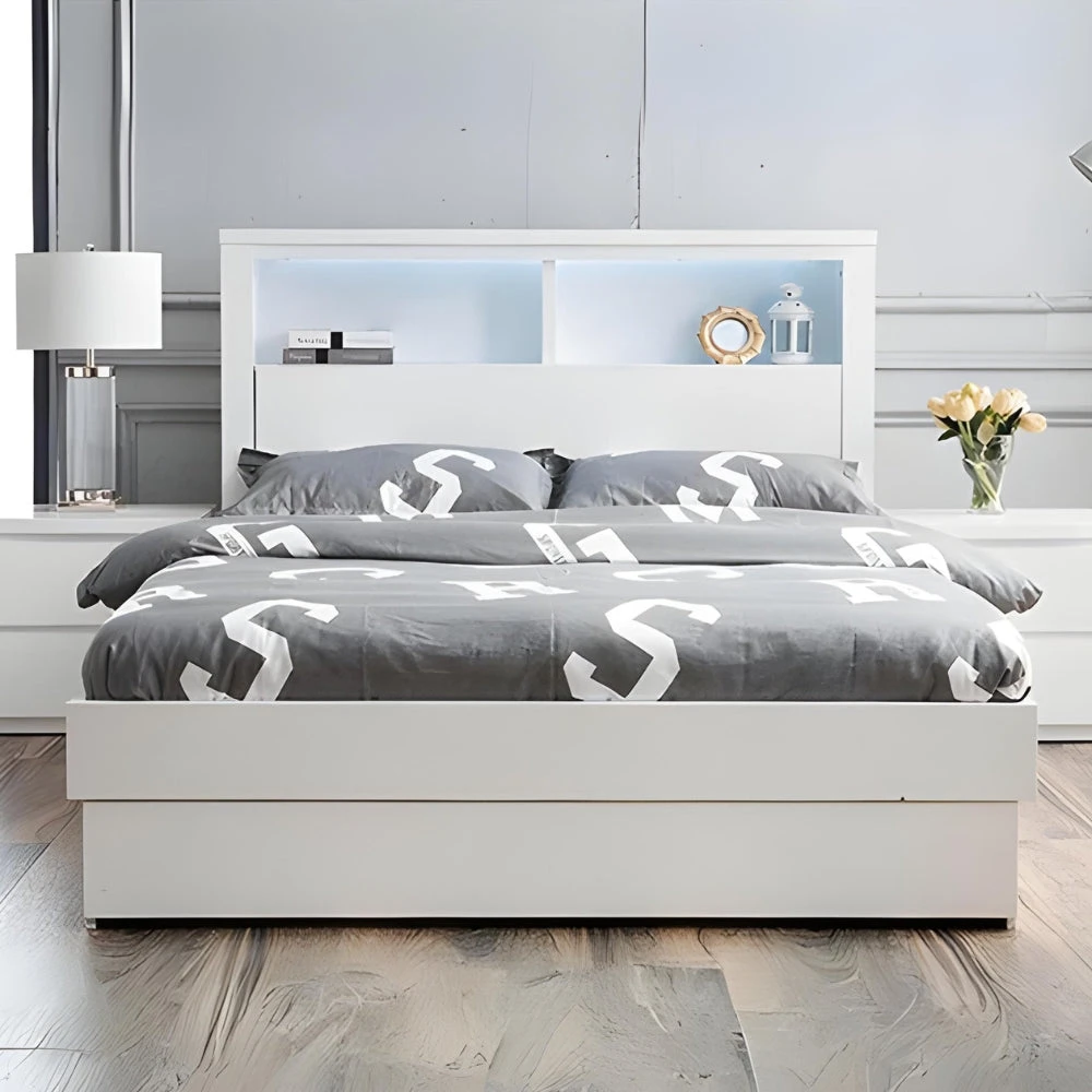 Elevate your sleep sanctuary effortlessly with this modern and functional bed frame, combining sleek design with smart storage solutions for a truly relaxing environment.