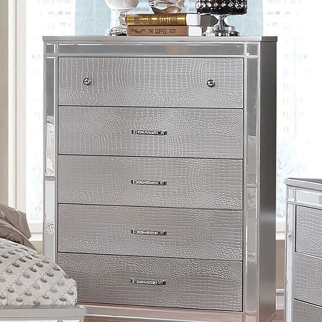 Get the most out of your bedroom with this contemporary style chest. The decorative mirror accents and ornate bun feet compliment these stylish features and the felt-lined top drawers blend traditional elements well.
