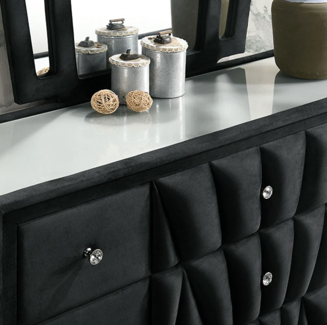 The ultimate Art Deco-inspired dressing table. The elegance and glamour of 1930’s Hollywood is right here. Velvet upholstery looks like it came right out of a classic black & white film. Chrome feet provide the finishing touch while additional embellishments such as nailhead trim faithfully enhance this cinematic reality.Additional embellishments such as chrome feet and crystal handles faithfully enhance the cinematic reality. Dresser comes complete with mirror.