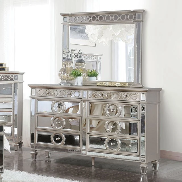 The exquisite details make up this stunning dresser with circular motifs found all over the set. Never mind the copious amount of mirror accents on this piece either—it works beautifully in complementing the luxurious feel of the set.