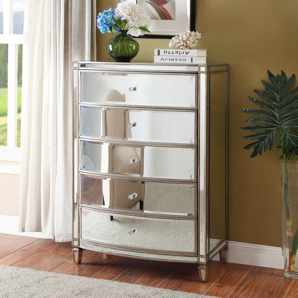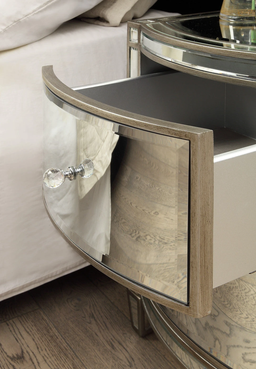 Each drawer has a felt lining and is a soft close drawer finished with crystal effect handles.