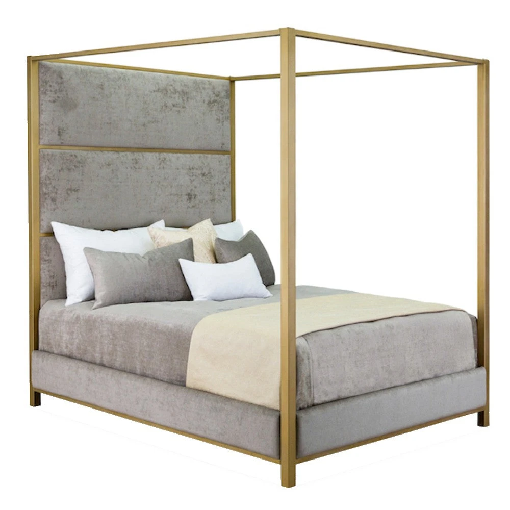 Fresh and inviting, the Sansa upholstered iron bed uses a simple squared-off silhouette making it impressive without intrusion. Resting beneath a lofty headboard and atop a minimalist square frame, the use of fabric accents; soften the edges and makes this crisp design flow beautifully into existing decor themes. Straight square legs keep this bed perfectly balanced in both function and aesthetics; a smart addition to any bedroom