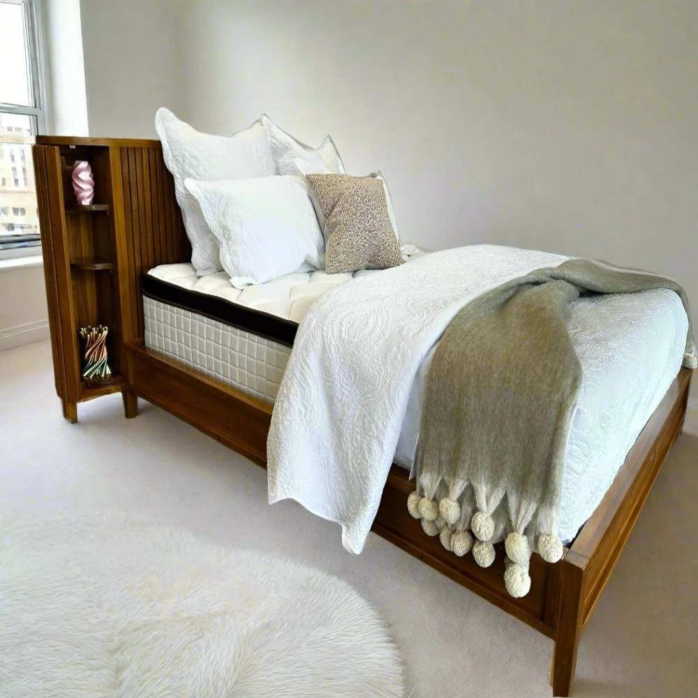 Introducing our Sydney Bookend Bed, a masterful creation of elegance and functionality. Handcrafted with precision, this space-saving bed features discreet storage space behind its sleek slatted design. The headboard boasts three shelves, providing purpose and a delightful surprise. Elevate your bedroom to a new level of luxury with our Sydney Bookend Bed.